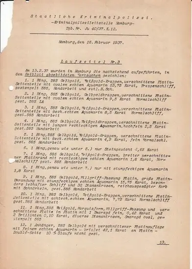 Freie Beschreibung: DIN A4, gelocht. 3 Blatt, davon eine Seite mit 28 Abbildungen und drei weitere Seiten mit den Beschreibungen der gestohlenen Ring, Anhänger, Nadel, Brosche, Armband, Steinkette. Etwas gebräunt und randlädiert