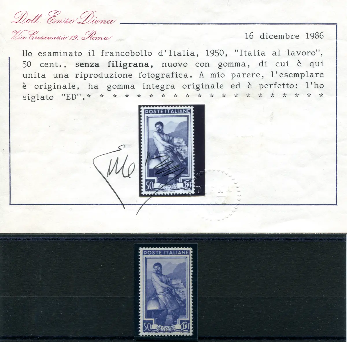 MNH Vollgummi - Arbeit Cent. 50 n. 634a ohne Wasserzeichen - sehr gut zentriert - Cert. ED - Kat. euro 450 Cod. 464/16
