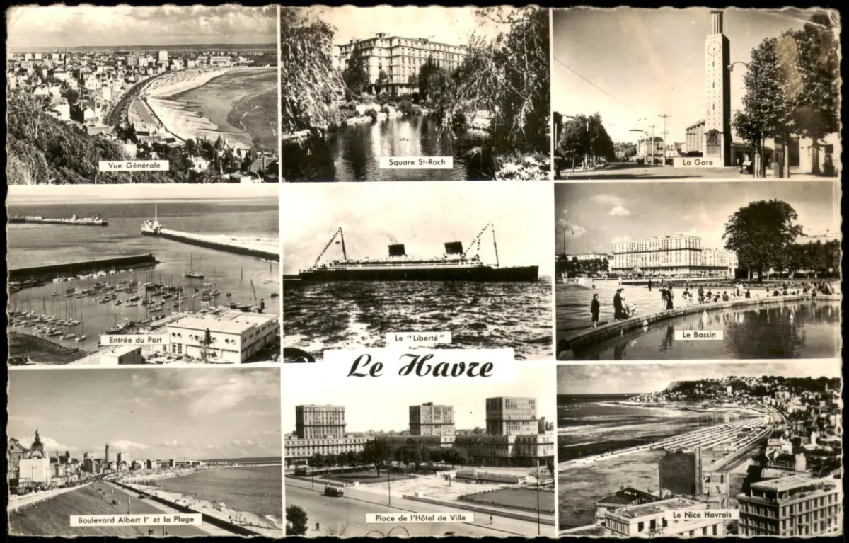 Le Havre Souvenir Mehrbild-AK u.a. mit La Gare Bahnhof, Schiff Liberté uvm. 1950
