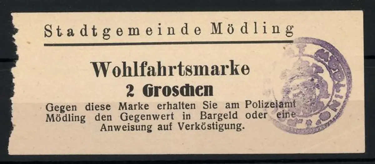Lebensmittelmarke Mödling, 2 Groschen, am Polizeiamt erhält man den Gegenwert in Bar oder Verköstigung