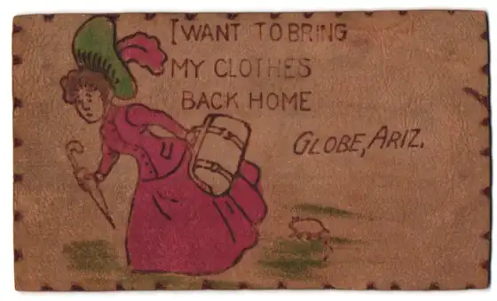 Leder-AK Globe, AZ, Frau in Ausgehkleidung rennt nach Hause