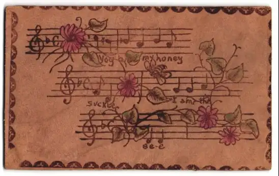 Leder-AK Noten mit Liedtext You are my honey suckle, I am the bee, rote Blüten