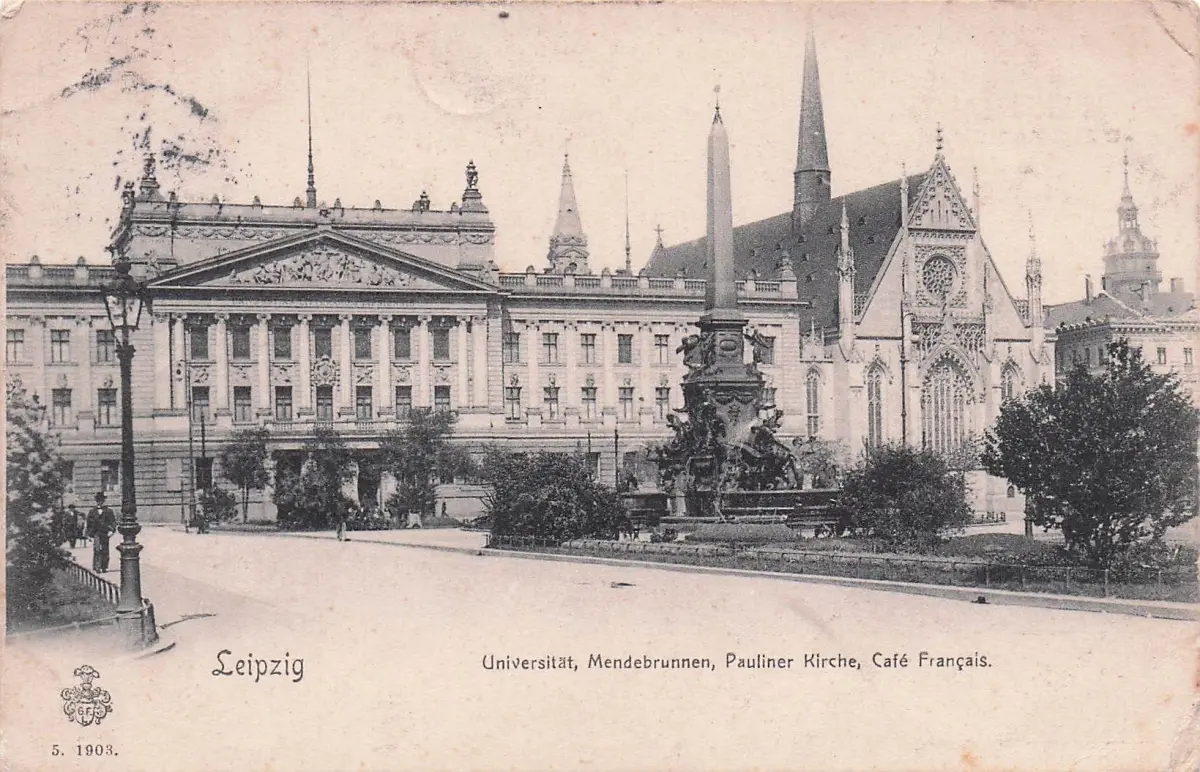 Leipzig, Mendebrunnen, Paulinerkirche, Cafe Francais 1903 Loch -797858