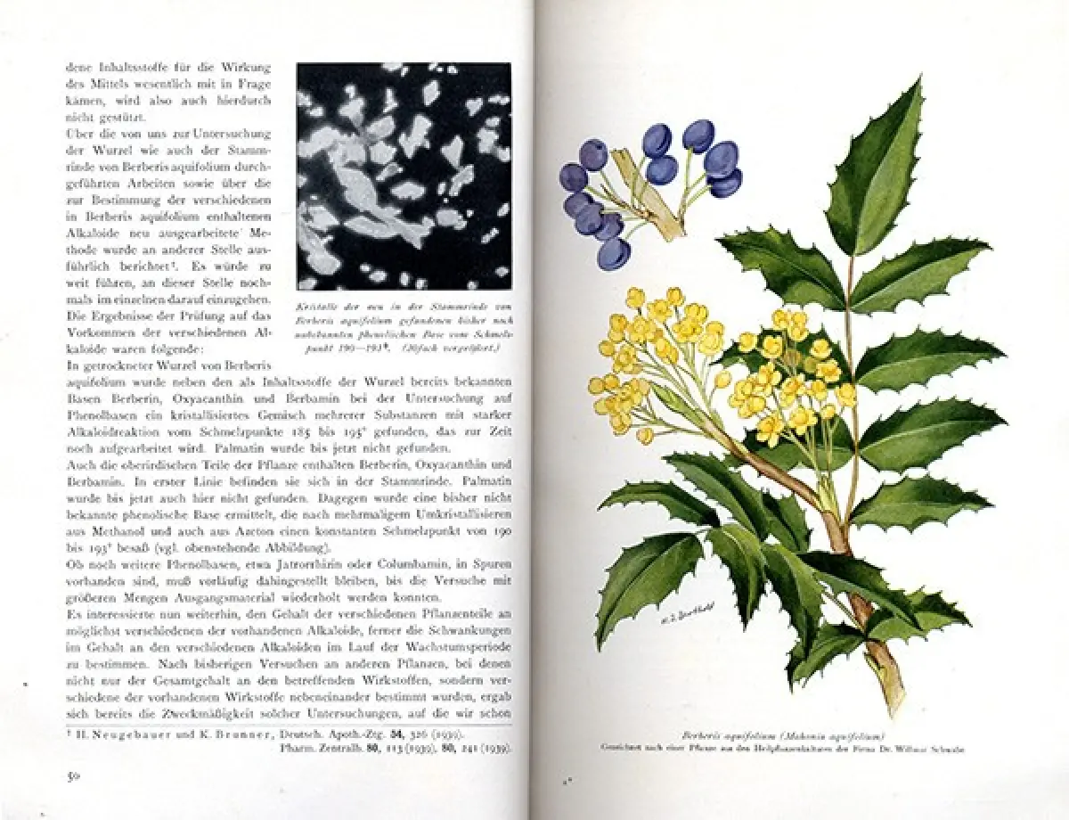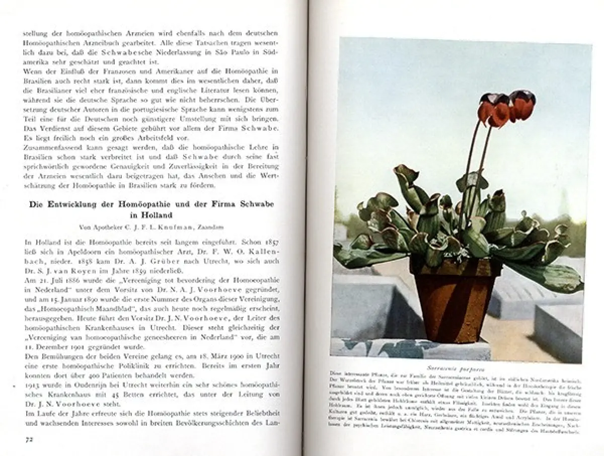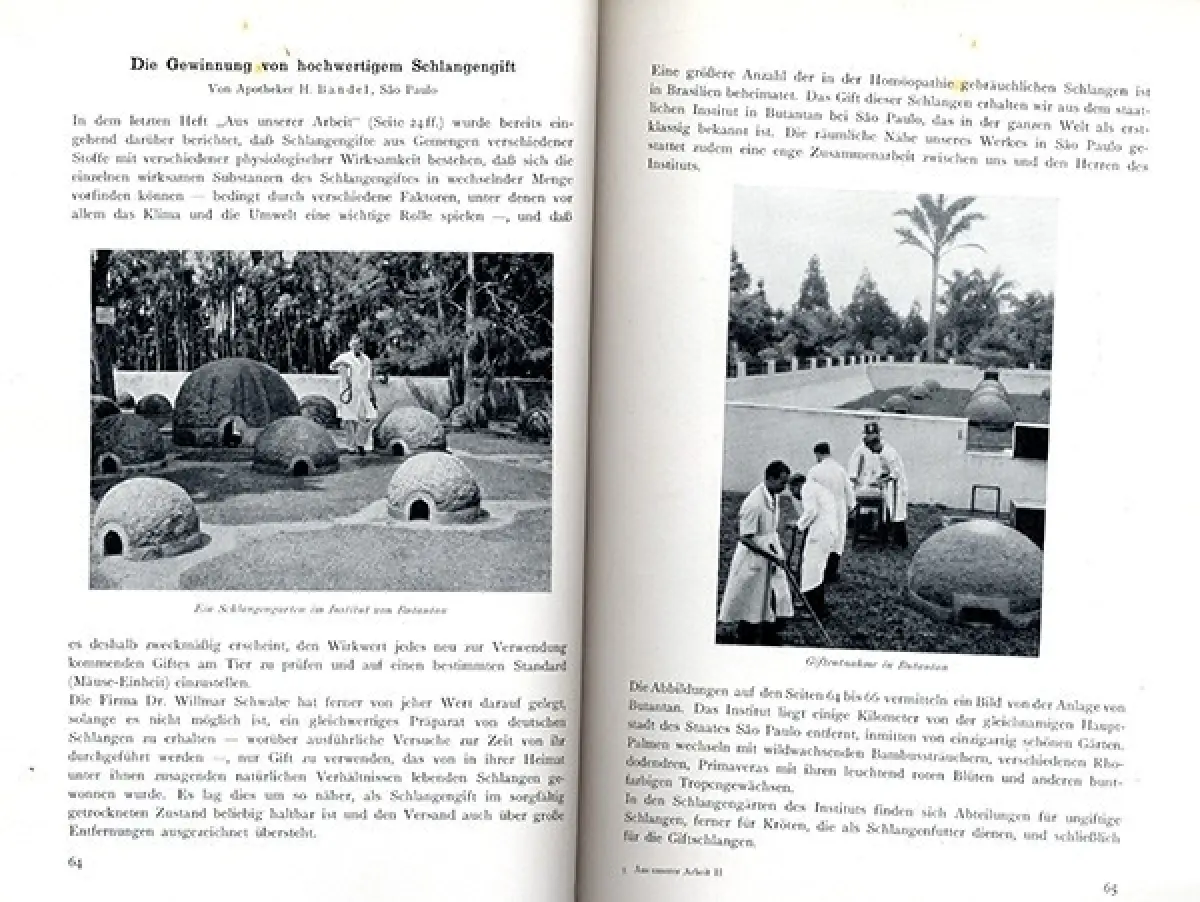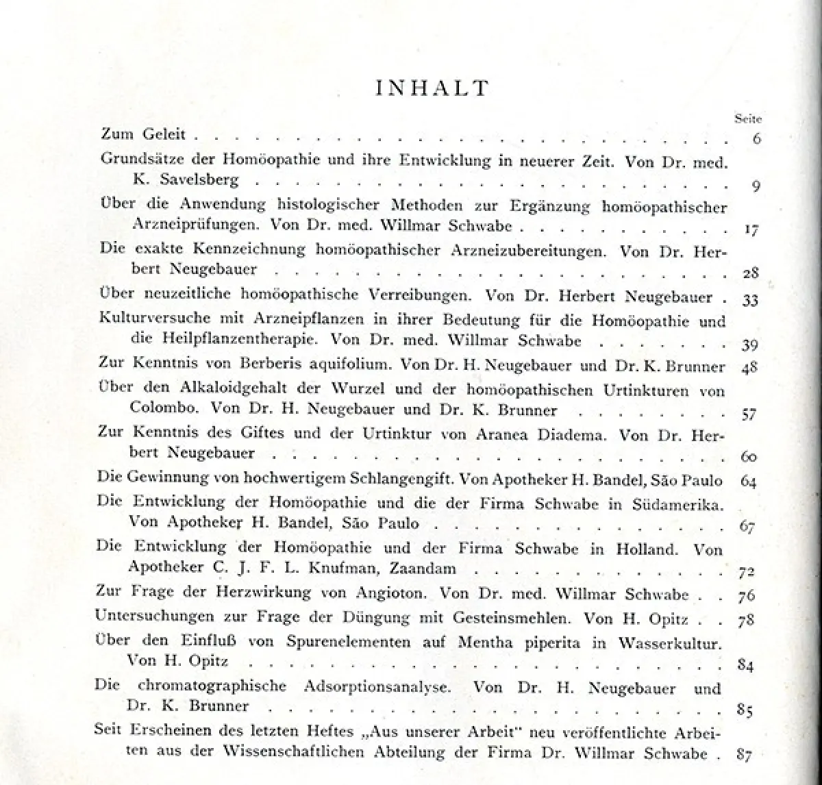 mit GESAMT 88 Seiten fotografischen und druckgrafischen Abbildlungen Geschichte und Entwicklung der Firma Willmar Schwabe Aufgaben und Tätigkeitsfelder Grundsätze der Homöopathie Anwendung histologischer Methoden bei Arzneimittelprüfung Stand der Forschung Kulturversuche mit Arzneipflanzen der Akaolidgehalt der Wurzel und das Problem homöopathischer Urtinkuren Gewinnung von Schlangengift Tätigkeit der Firma Schwabe in Südamerika weitere Berichte zu Forschungs und Arbeitsergebnissen der Firma Willmar Schwabe