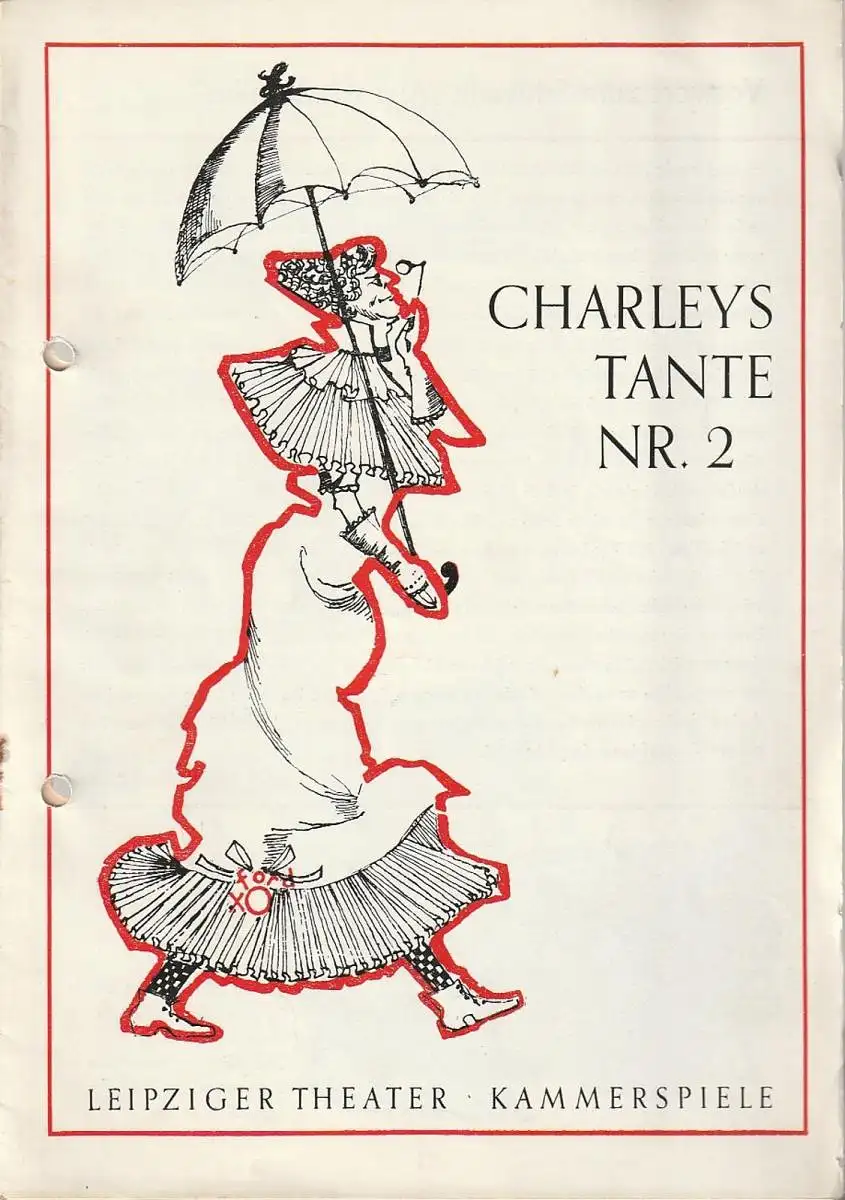 Erstaufführung. Ein Lustspiel aus der guten, alten Zeit von Thomas Wild und Michael Brenner nach Charleys Tante von Brandon Thomas. Musik: Uwe Ködderitzsch. Regie: Peter Röll. Bühne: Max Elten. Kostüme: Renate Scheffel-Thomas. Mitwirkende: Fred Kötteritzsch, Erich Giesa, Kurt Kachlicki, Jürgen Muck, Wolfgang Jakob, Hans-Robert Wille, u.a. - Theaterprogramm, Opernprogramm, Ballettprogramm, Musicalprogramm, Konzertprogramm, Theatermemorabilia, Programmhefte Sammlung, deutsche Theatergeschichte.