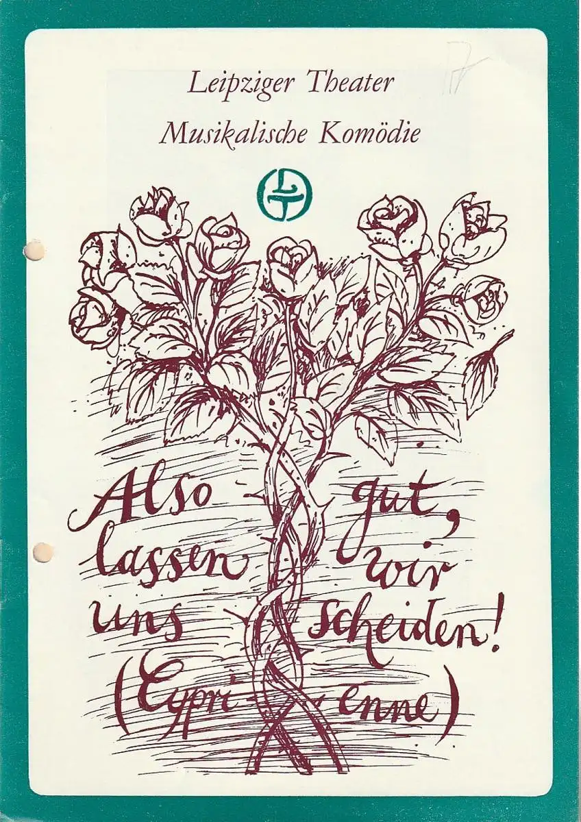 ( Cyprienne ). Musikalische Komödie nach einem Lustspiel von Sardou und Najac in der deutschen Fassung von Heinz Hilpert. Buch und Gesangstexte von Curth Flatow. Musik von Gerhard Jussenhoven. Musikalische Leitung: Walter Hessel. Inszenierung: Klaus Winter. Bühne: Hans Claus. Kostüme: Marlis Knoblauch. Choreographie: Monika Geppert. Mitwirkende: Karl Zugowski, Margarete Junghans, Ullrich Graichen, Peter Vorwerg, Angela Mehling-Hochmuth, Sylvia Arndt, Gerda Hannemann, Johannes Fritsch, u.a. - Theaterprogramm, Opernprogramm, Ballettprogramm, Musicalprogramm, Konzertprogramm, Theatermemorabilia, Programmhefte Sammlung, deutsche Theatergeschichte.