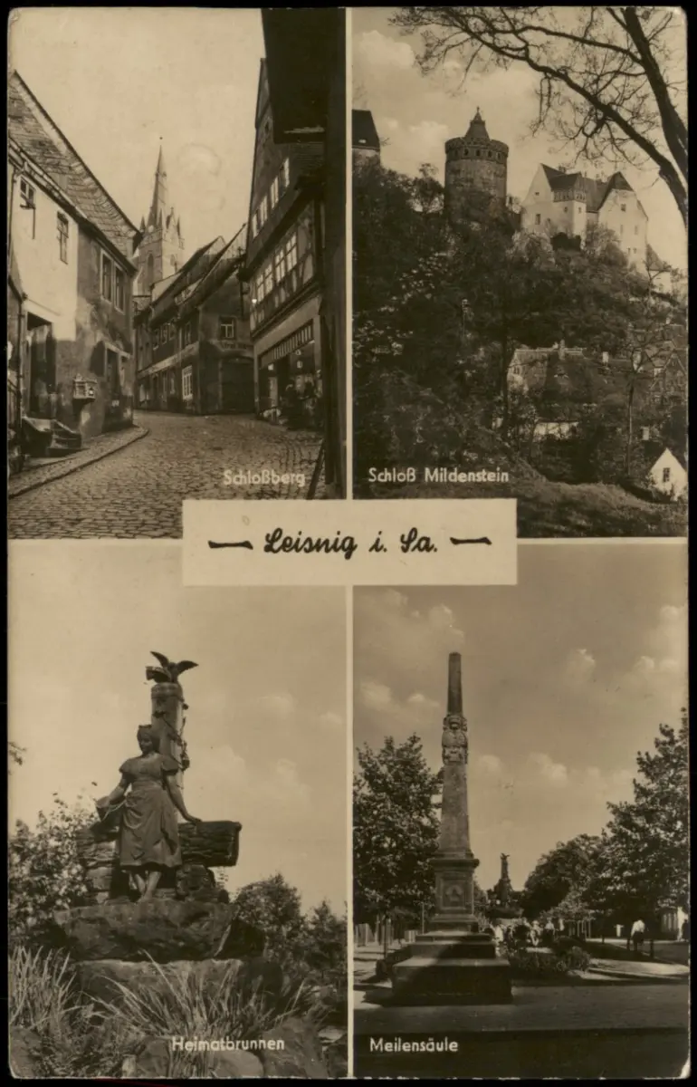 Leisnig DDR Mehrbild-AK mit Heimatbrunnen Meilensäule Schloß Mildenstein 1958