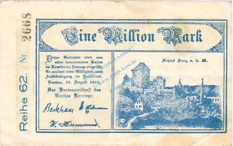 Lennep , Banknote 1 Million Mark Schein gbr. Keller 3215.f , Rheinland 1923 Inflation