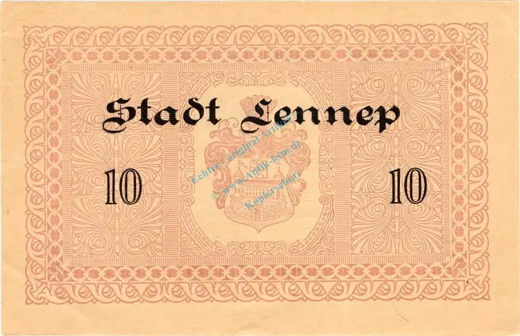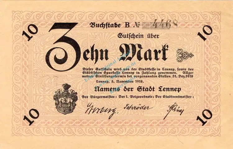 Lennep , Banknote 10 Mark Schein f-kfr. Geiger 315.06.b , Rheinland 1918 Grossnotgeld