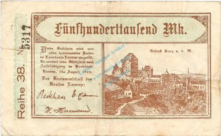 Lennep , Banknote 500.000 Mark Schein gbr. Keller 3215.f , Rheinland 1923 Inflation