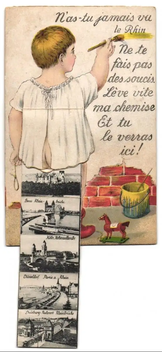 Leporello-AK Bonn, Ansichten unterm Hemdchen, Rheinbrücke, Köln, Düsseldorf, Kapellen und Stolzenfels