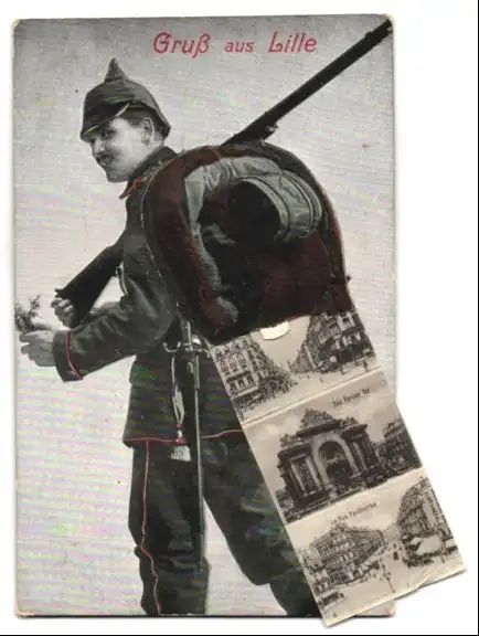 Leporello-AK Cirey, Soldat mit Ansichten im Marschgepäck, Strassenpartie mit Kirche