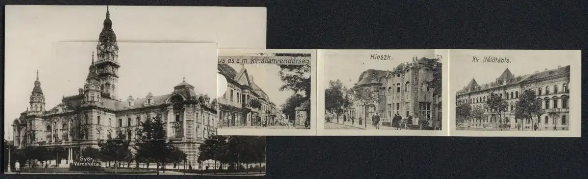 Leporello-AK Györ, Városháza, Pályaudvar, Fehérajó szálloda, Püspökvár, Bisinger sétány, Széchenyi tér