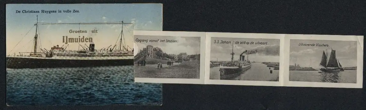 Leporello-AK Ijmuiden, De Christiaan Huygens in volle Zee, SSPC Hooft kiest Zee, Binnenkomende Logger, Hoogovens