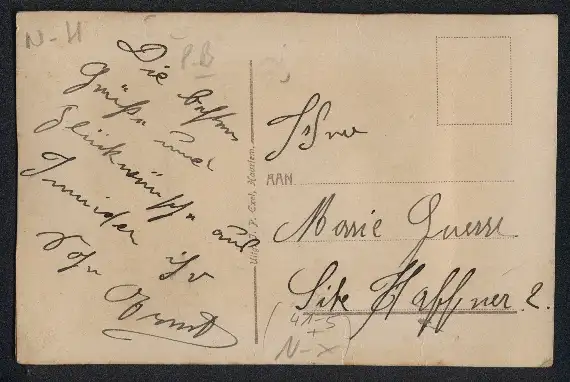 Personenbezogene Daten auf der Rückseite der Karte wurden durch blauen Textmarker unkenntlich gemacht. Die blauen Stellen sind auf die Vorderseite durchgeweicht und wirken sich negativ auf das Postkartenfoto aus