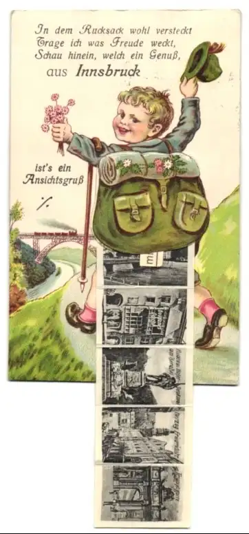 Leporello-AK Innsbruck, Ansichten im Rucksack, Innbrücke mit Mariahilf u. Hölting, Herzog Friedrichstr., Triumphpforte