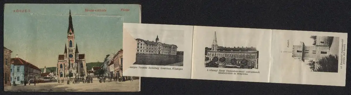 Leporello-AK Köszeg, Strucz-szálloda, Fö-tér, Reáliskolai nevelöintézet, Evang. leángimnázium