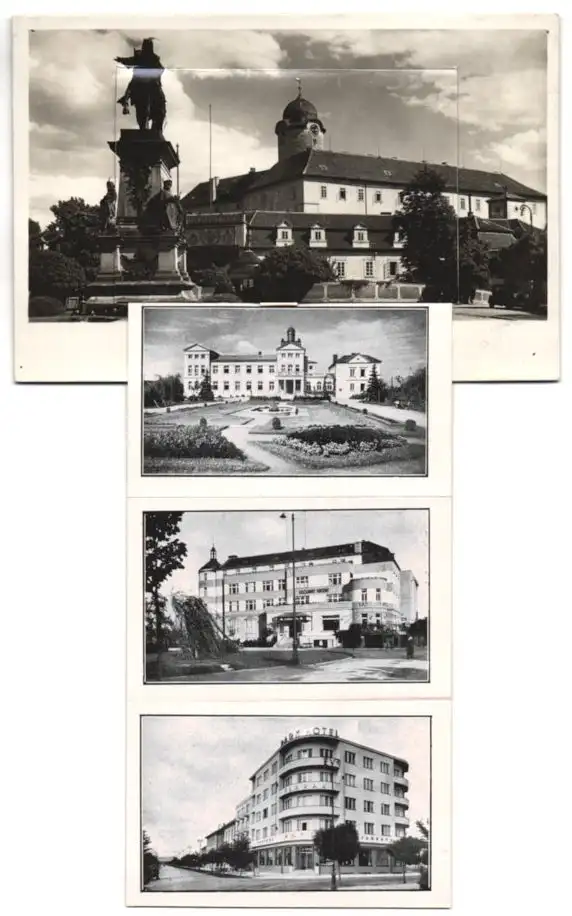 Leporello-AK Lázne Podebrady, Hotel, Strassenpartie, Denkmal