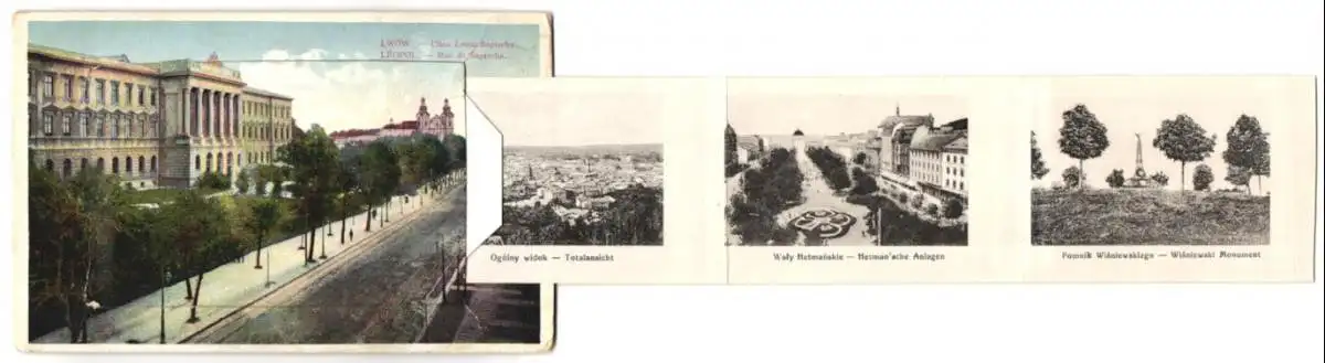 Leporello-AK Lwow, Sapiecha-Gasse, Marienplatz, Halickiplatz und Walowagasse, Sykstukagasse, Akademischer Platz