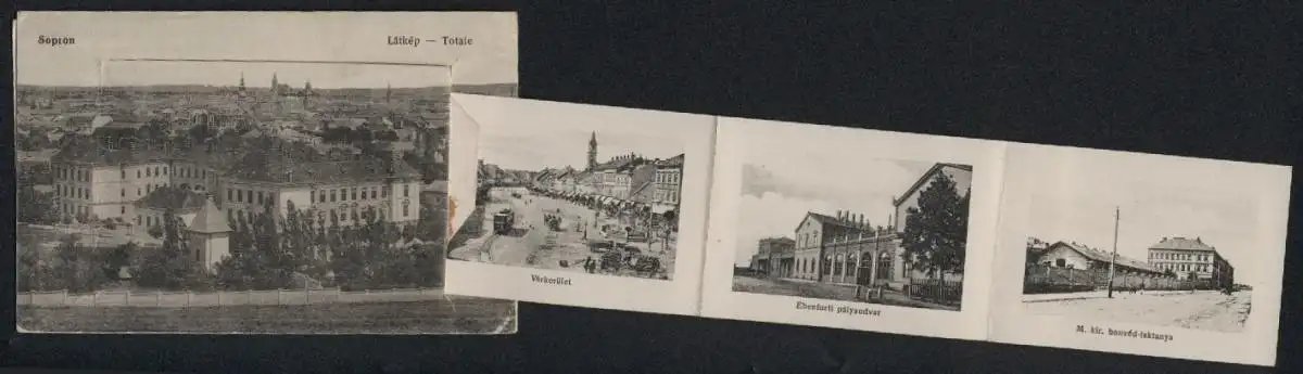 Leporello-AK Sopron, Látkép, Délivasut állomás, Muzeum, Városháza, Honvéd föreáliskola, Szinház