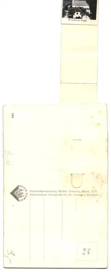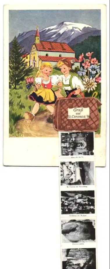 Leporello-AK St. Corona a. W., Ansichten hinter der Tasche, Altar der Kirche, Kirchberg am Wechsel, Hermannshöhle