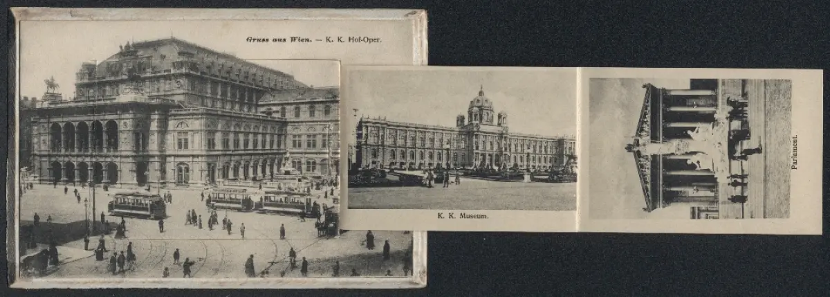 Leporello-AK Wien, K. k. Hofoper mit Strassenbahnen, Universität, Parlament, Rathaus, Votivkirche