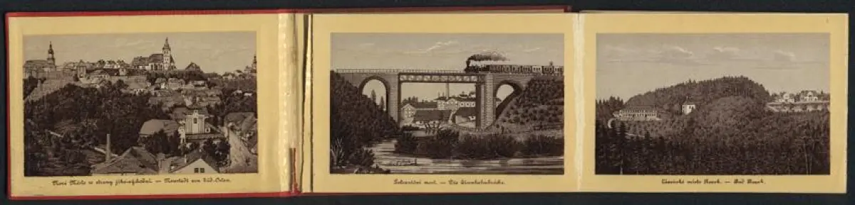 Leporello-Album 14 Lithographie-Ansichten Neustadt a. d. Mettau, Eisenbahnbrücke, Buchdruckerei Th. Böhm, Bezirksgericht