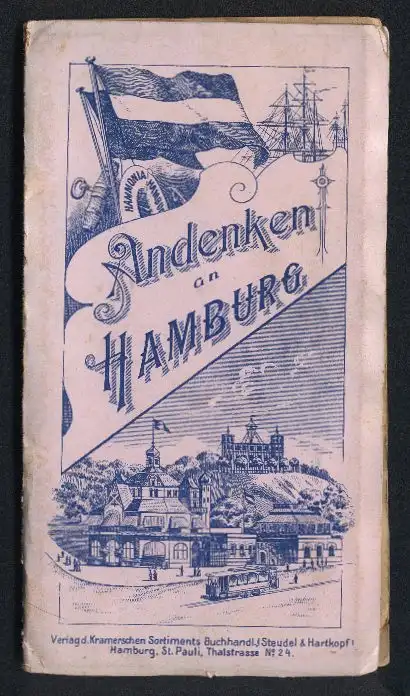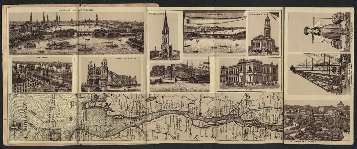 Leporello-Album Hamburg mit 22 Lithographie-Ansichten, Neue Elbbrücke, Börse, Reimers-Fleet, Vierländerin, Riesen Kran