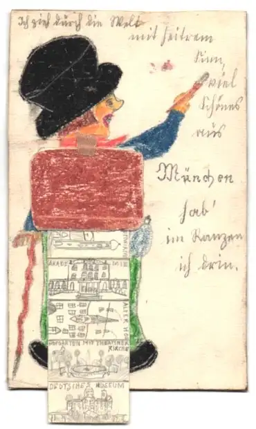 Leporello-Künstler-AK Handgemalt: München, Ansichten im Rucksack, Deutsches Museum, Chinesischer Turm, Alter Hof