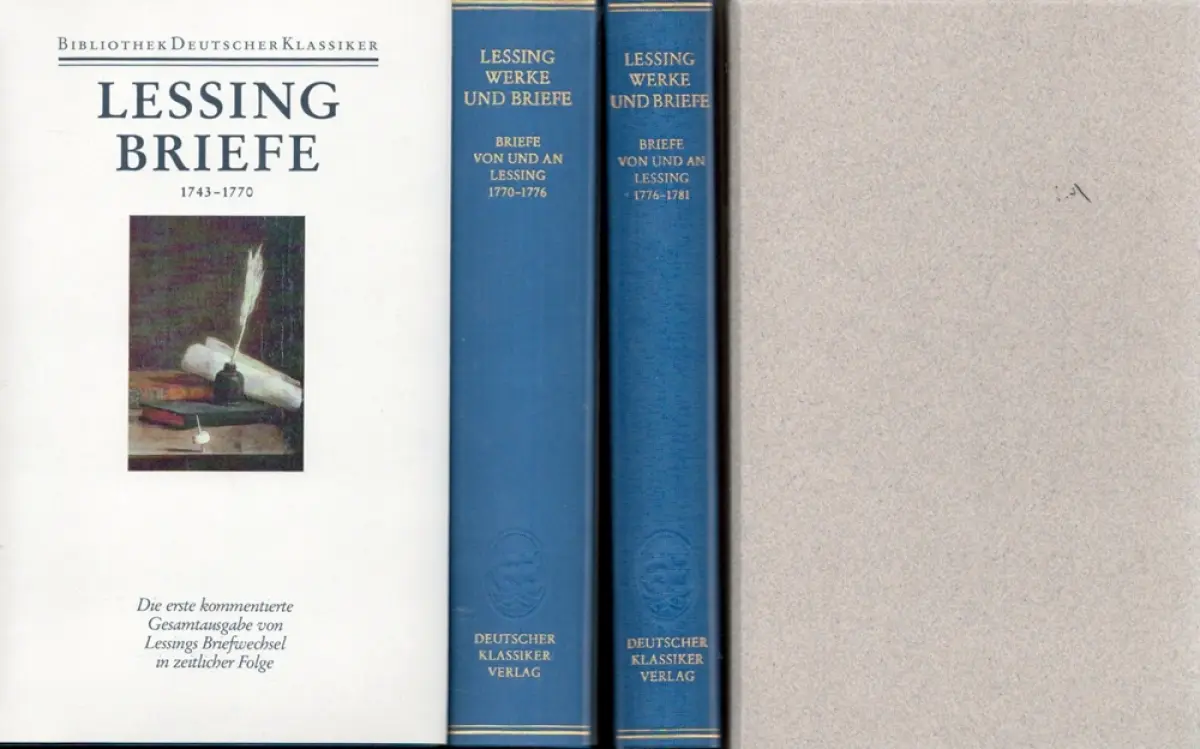 Die erste kommentierte Gesamtausgabe von Lessings Briefwechsel in zeitlicher Folge von 1743 bis 1781. "Diese ganz aus dem wirklichen Leben genommene Unterhaltung« (Hegel) mit ihrer überraschend großen Vielfalt von Motiven und Themen, die schlechterdings nicht zu benennen, sondern nur dem Leser erfahrbar sind". (Verlagstext). - Mit umfassendem kritischen Kommentarteil, Verzeichnissen und Übersichten. - Zwei Schuber im äußersten Einschubrand minimal fleckig. Die Bücher gepflegt, gut und sauber