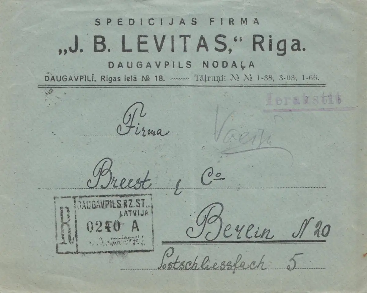 Lettland: 1928: Einschreiben Daugavpllils Nodala nach Berlin