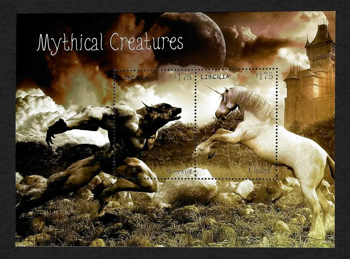 Liberia: Mythical Werewolf, Unicorn, Einhorn, Wehrwolf, Block mnh