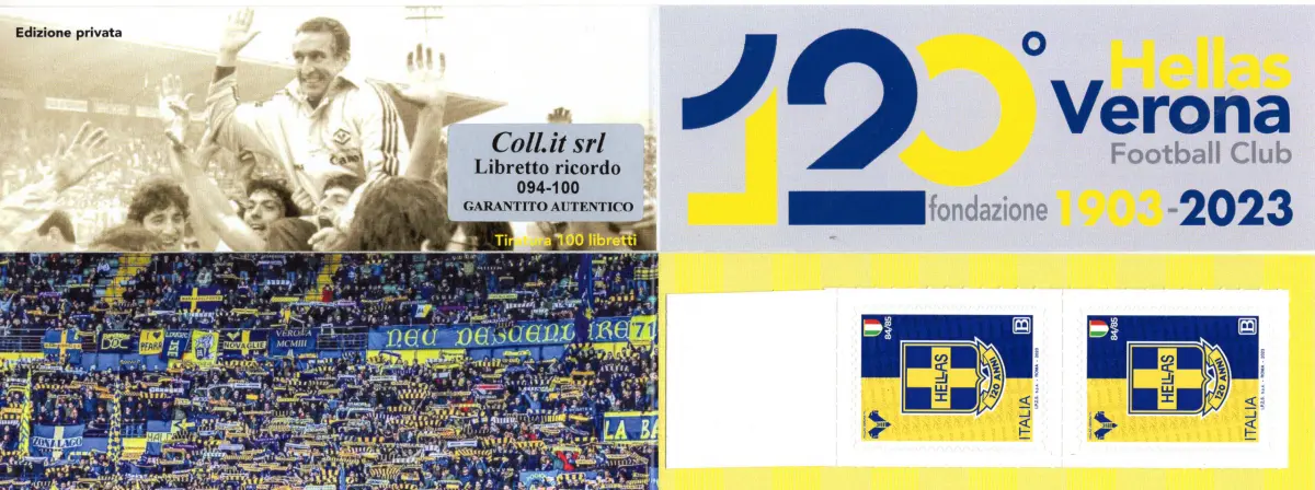Libretto Calcio 120. Jubiläum Hellas Verona - Privatausgabe - Nur 76 vorhandene Libretto/Carnet Privatausgabe nummeriert von nur 100 Exemplaren, enthält ein horizontales Paar der von der italienischen Post ausgegebenen Briefmarke mit Barcode - Auf der Rückseite fälschungssicheres VOID-Etikett mit der Nummer - Nummerierung 1 bis 24 enthält Paar Barcode-Blattrand (nur 24 vorhanden), Nummer 25 bis 100 enthält Paar Bogenrand (nur 76 vorhanden) - VERSAND ERFOLGT EIN BOOKLET MIT NUMMER 026 bis 100 Kat. Unified Nr. LC 1/23