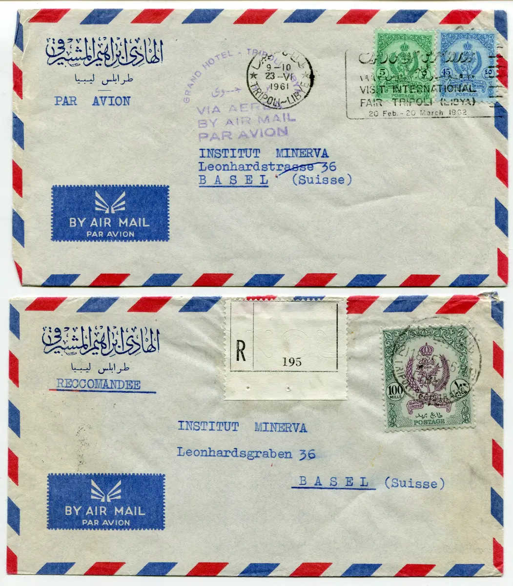 Libyen Vereinigtes Königreich - Zwei Aerogramme für die Schweiz - Libyen Vereinigtes Königreich - Zwei Aerogramme für die Schweiz mit unterschiedlicher Frankatur Serie Wappen; eines mit 100 m. Nr. 100 isoliert (Rac.) und der andere mit Nr. 92 + 98 - Schöner und ungewöhnlicher Code 900/7