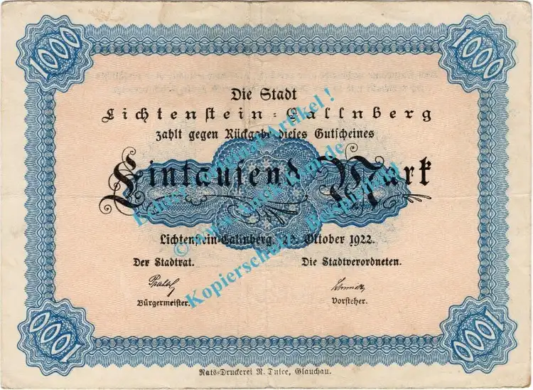 Lichtenstein Callnberg , Banknote 1.000 Mark Schein in gbr. Müller 2715.7.a , Sachsen 1922 Inflation