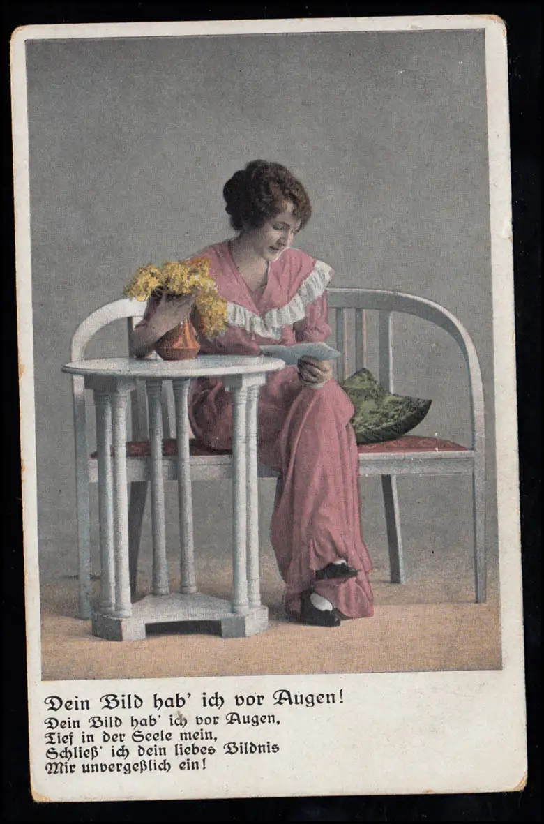 Liebes-AK Lächelnde Frau mit Liebesbrief auf der Bank, Feldpost 31.5.1917