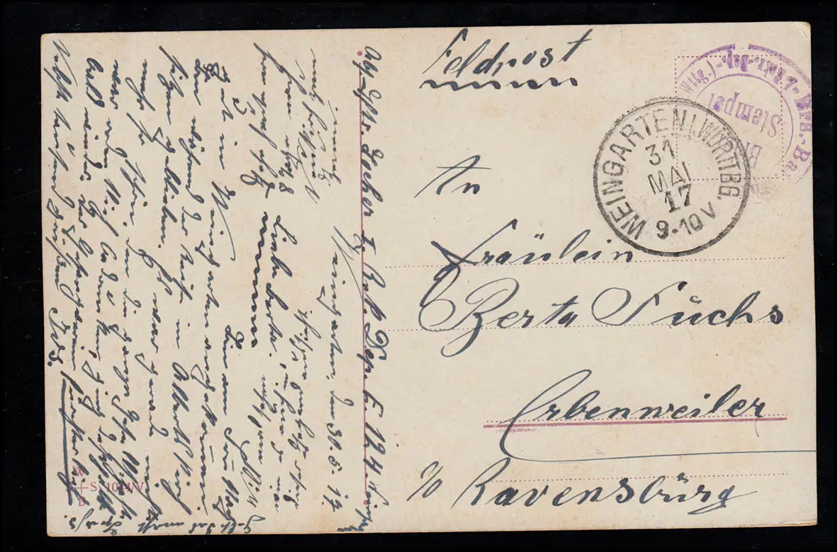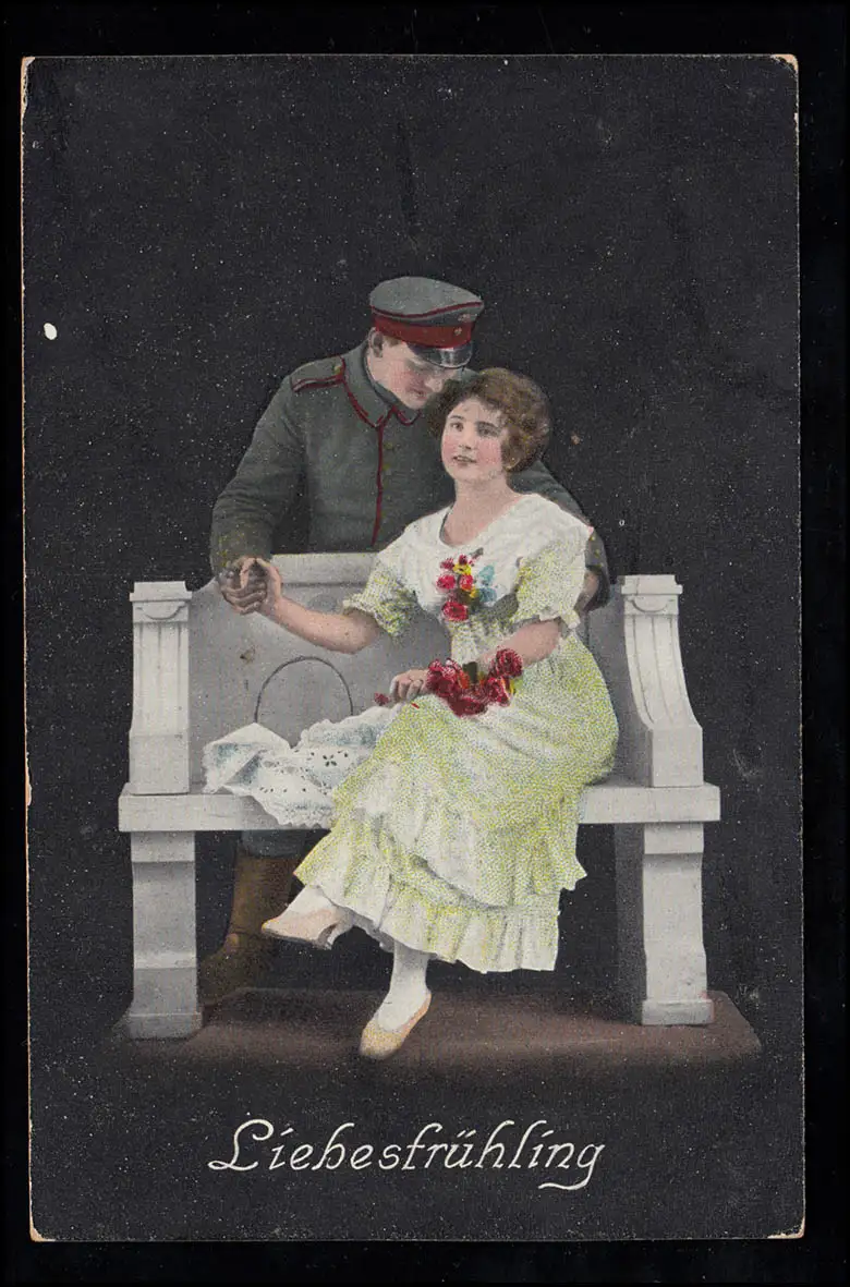 Liebes-AK Liebespaar - Liebesfrühling, Feldpost WEINGARTEN i. WÜRTTBG. 31.5.1917