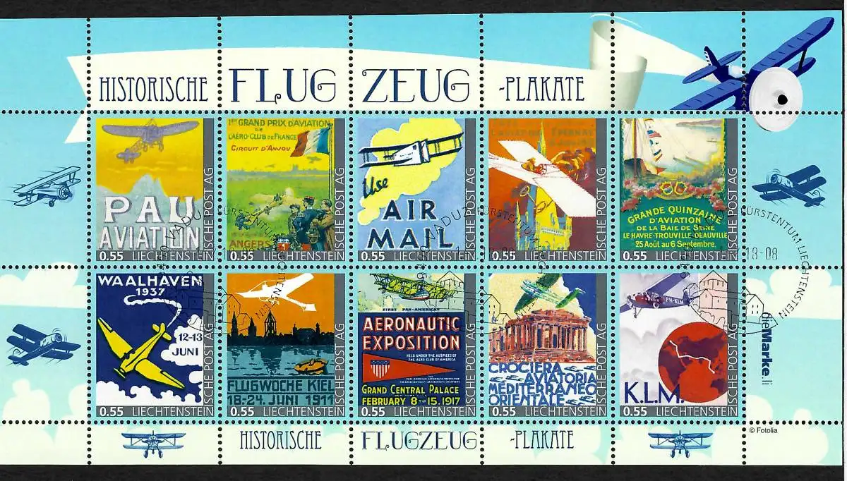 Liechtenstein 2018: Historische Flugzeug-Plakate, gestempelter Kleinbogen