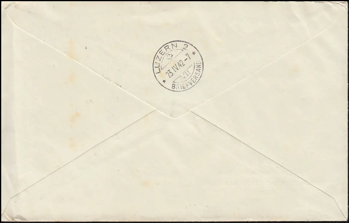 Eilsendung per Einschreiben von der Fürstlich liechtensteinischen Verschleißstelle für Postwertzeichen Vaduz nach Luzern, Ankunftsstempel LUZERN 2 BRIEFVERSAND 23.4.42, Briefbug rechts