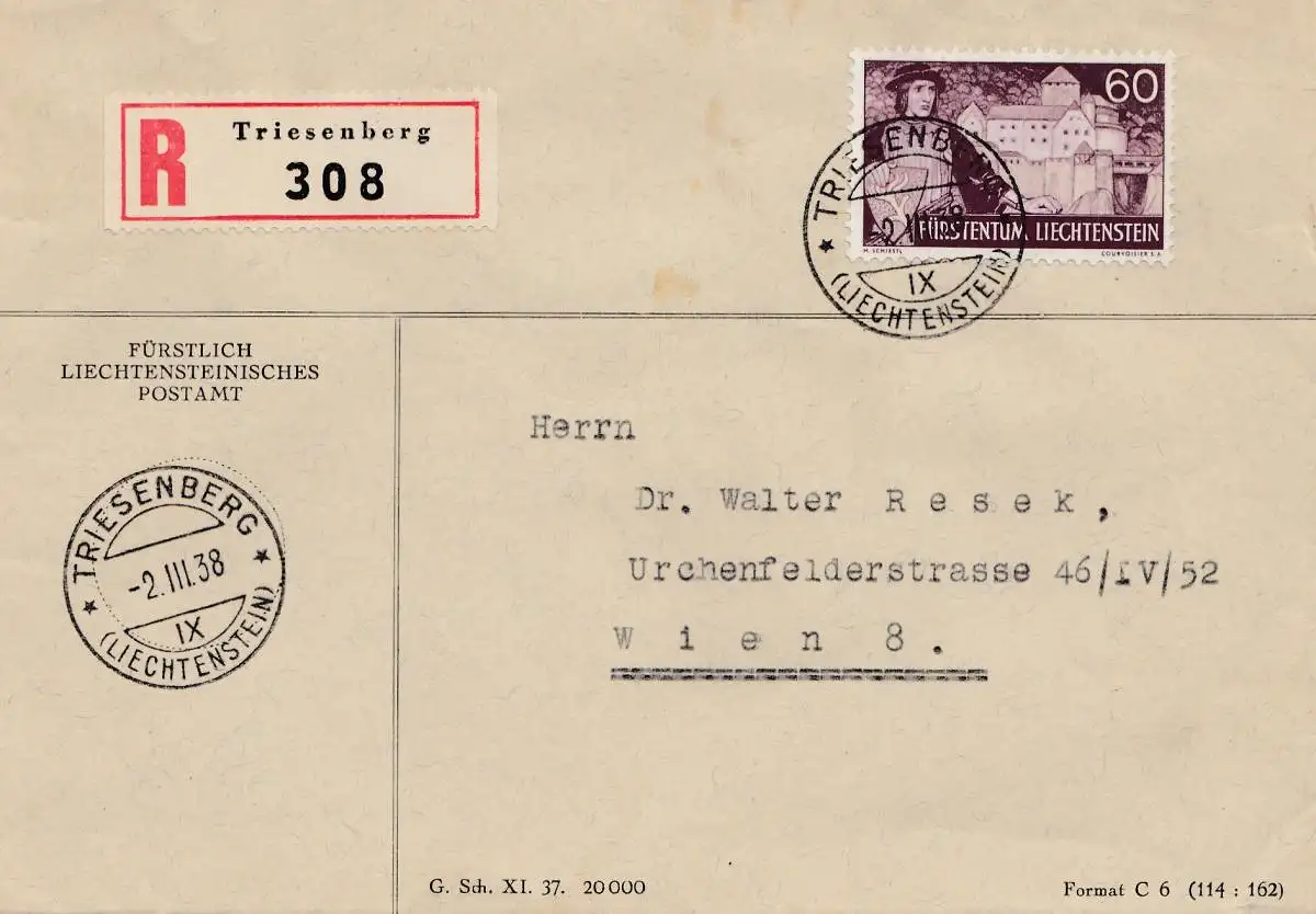 Liechtenstein: Triesenberg 1938 Einschreiben nach Wien