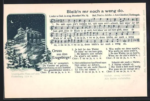 Lied-AK Anton Günther Nr. 19: Bleibn mr noch a weng do, Unterkunftshaus auf dem Fichtelberg