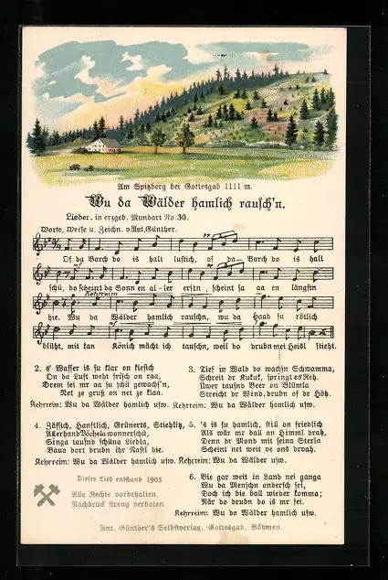Lied-AK Anton Günther Nr. 30: Wu de Wälder hamlich rausch'n, Text- und Notenzeilen, Spitzberg bei Gottesgab