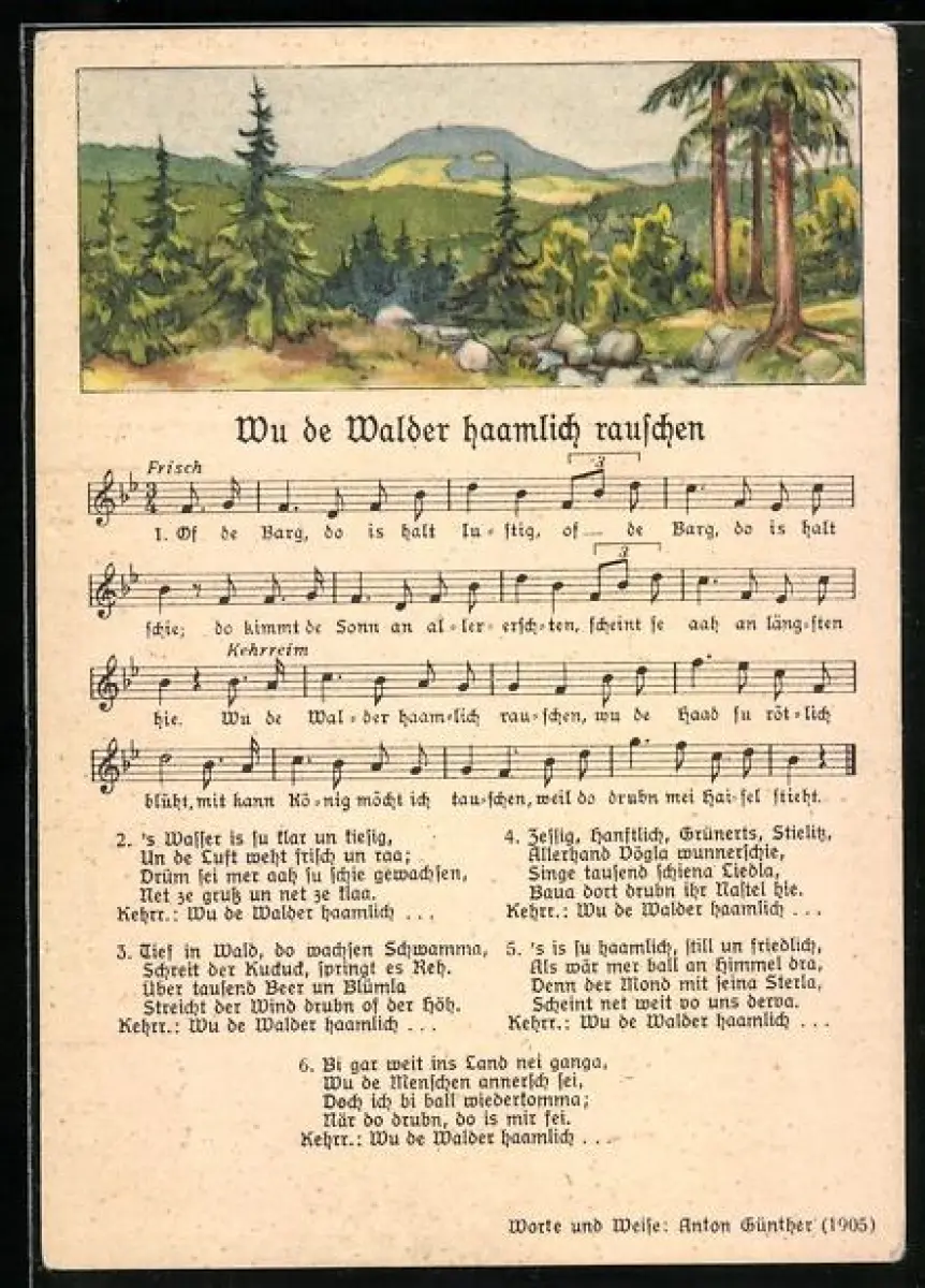 Lied-AK Anton Günther: Wu de Walder haamlich rauschen mit Text und Noten
