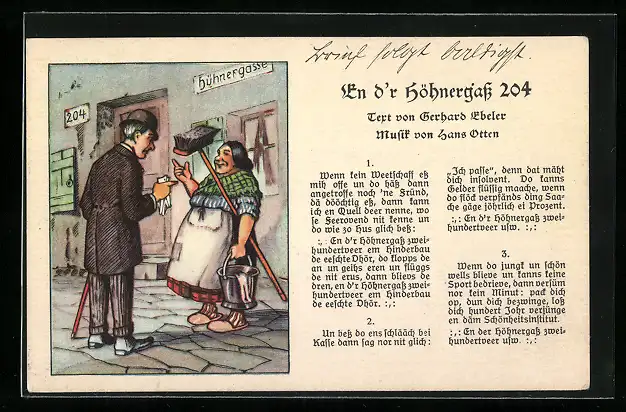 Lied-AK En d`r Höhnergass 204 von Gerhard Ebeler u. Hans Otten, ein Mann im Gespräch mit der Putzfrau
