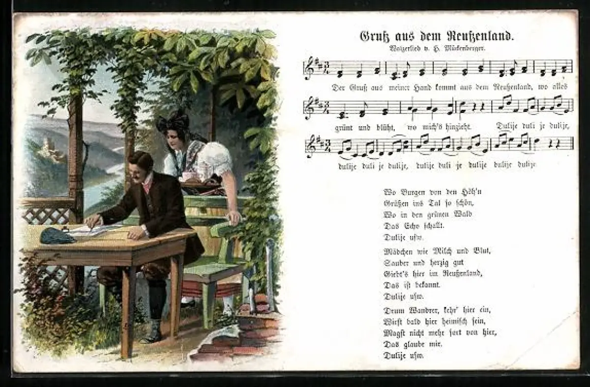 Lied-AK Hilmar Mückenberger: Lied Gruss aus dem Reussenland, Mann schreibt einen Brief