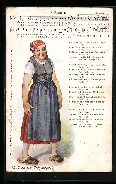 Lied-AK Hilmar Mückenberger: Lied `s Bärbele - Text, Noten, Magd in Hausschuhen