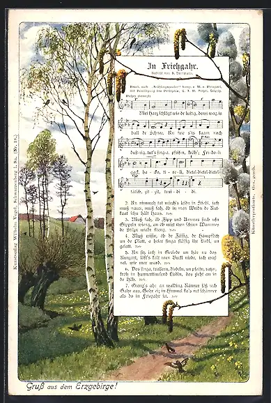 Lied-AK In Friehgahr, Lied in erzgebirgischer Mundart von M. v. Weinzierl, Birken u. Weiden am Wegesrand