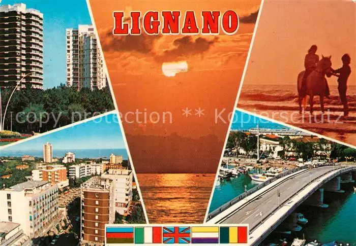 Lignano Hochhaeuser Bruecke Reiterin Abendstimmung Lignano postalisch gelaufen nach 1965 Erhaltung siehe scans [KathaD81] Kathoren