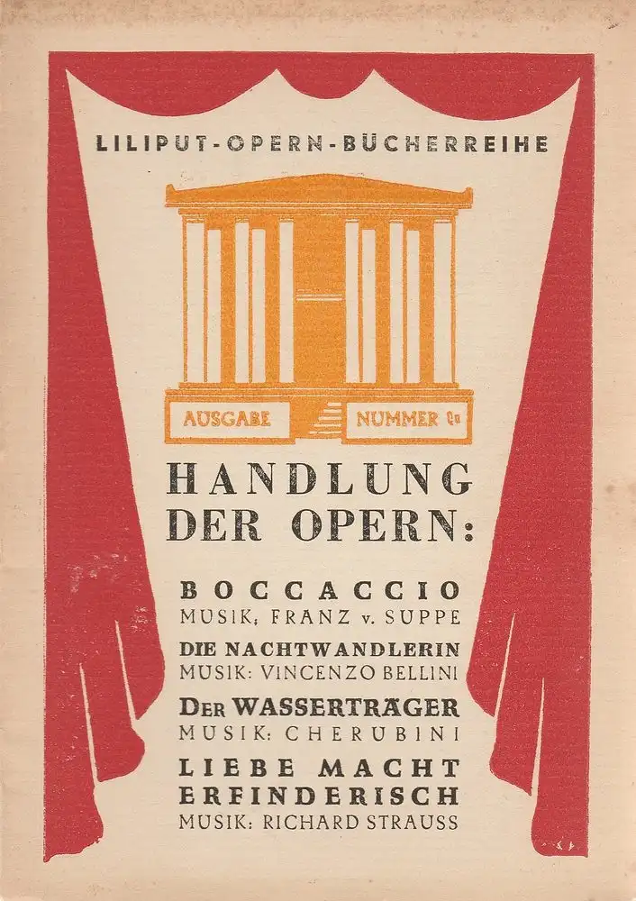 Handlung der Opern: Boccaccio Musik: Franz von Suppe / Die Nachtwandlerin Musik: Vincenzo Bellini / Der Wasserträger Musik: Cherubini / Liebe macht erfinderisch Musik: Richard Strauss - Theaterprogramm, Opernprogramm, Ballettprogramm, Musicalprogramm, Konzertprogramm, Theatermemorabilia, Programmhefte Sammlung, deutsche Theatergeschichte.