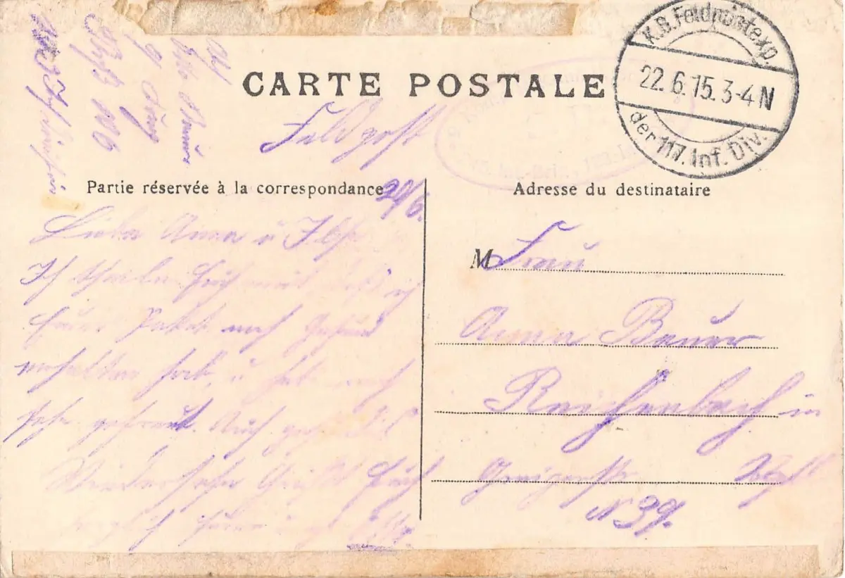 Rückseite: gelaufen als Feldpost 22.6.1915 der 117 Inft. Division